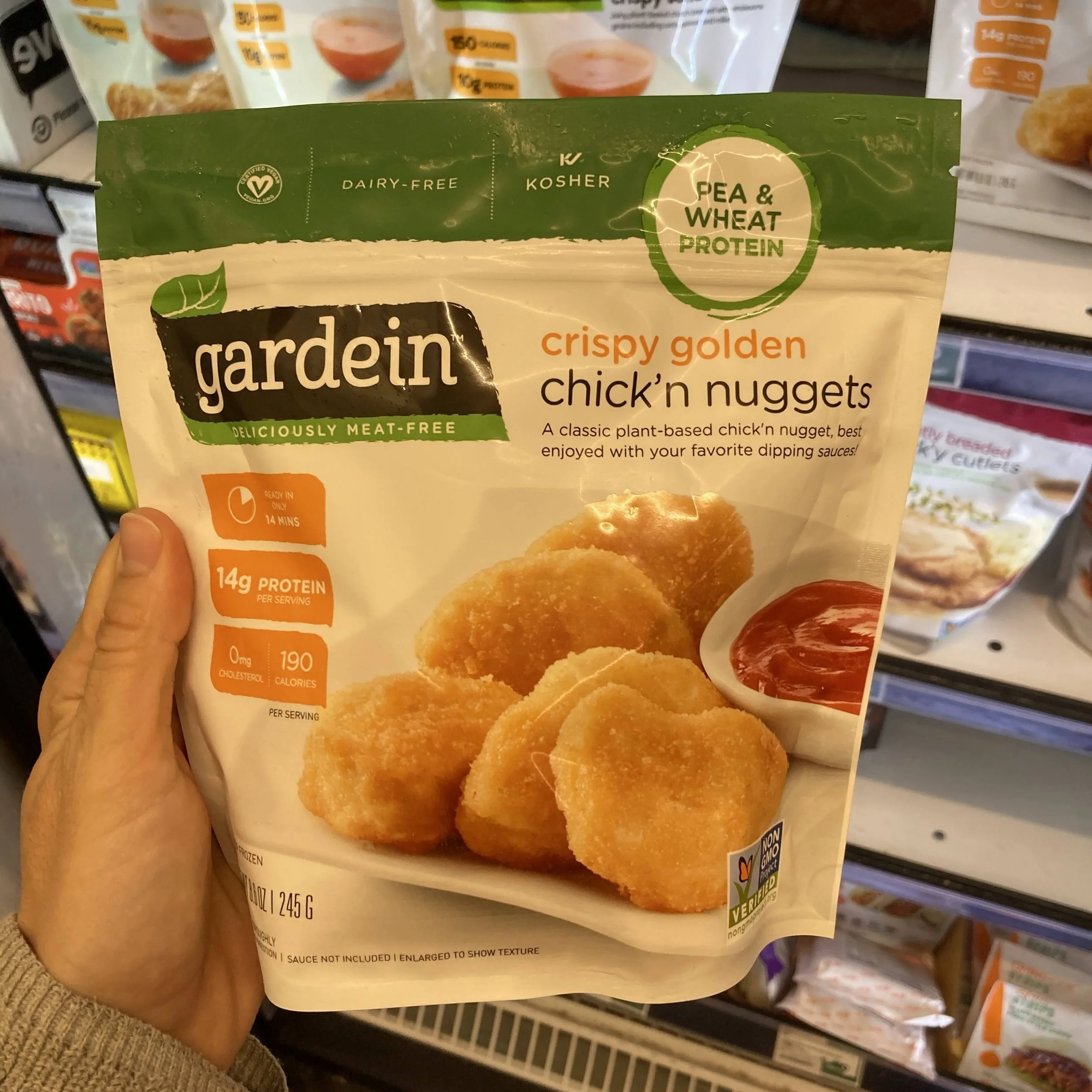 A plant-based and vegan option for chicken nuggets by Whole Foods’ own brand. They come with recipes in the background, and are non gmo.